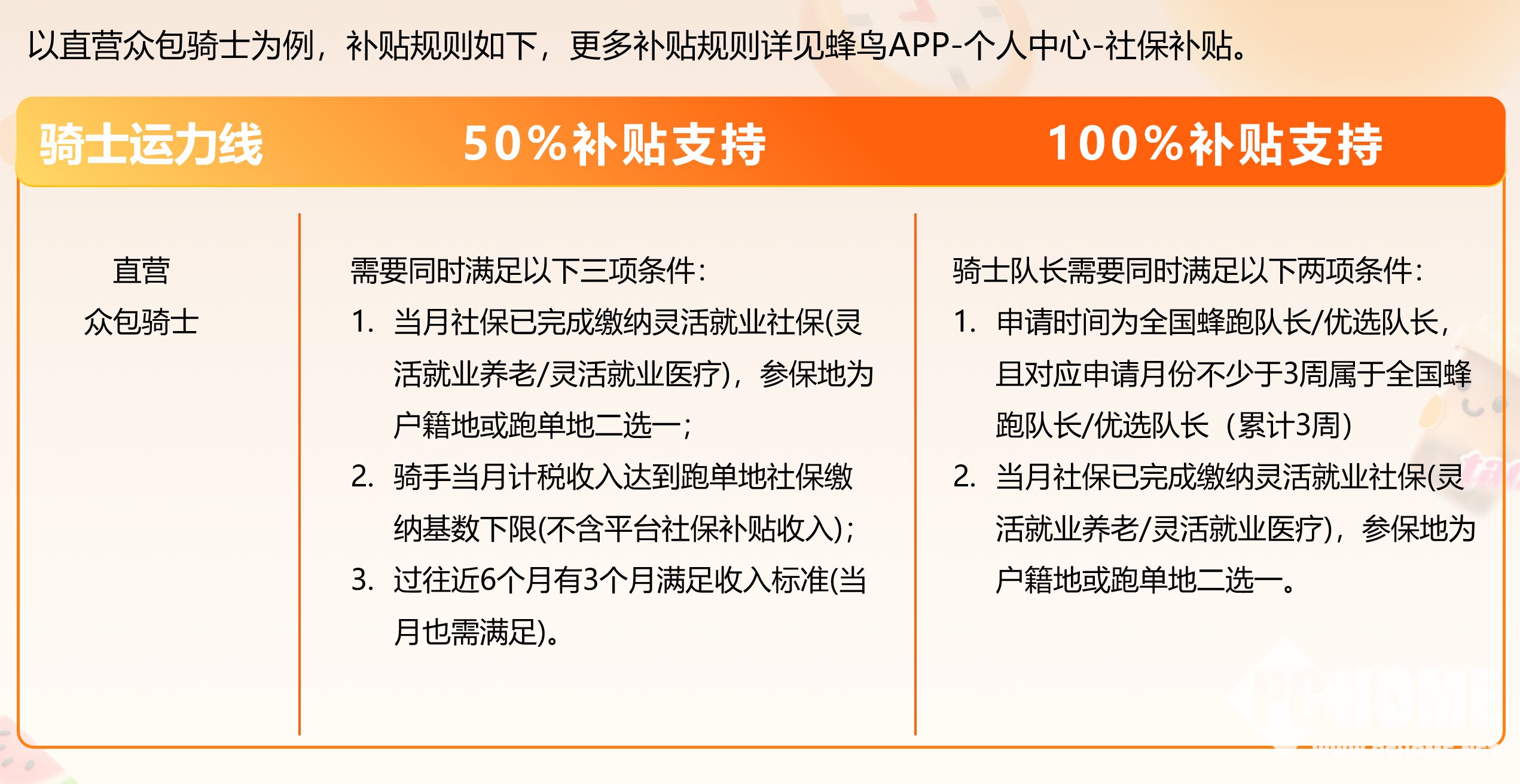 在申请资格与流程上,以直营众包骑士为例,50%补贴需满足当月缴灵活就业社保、计税收入达跑单地社保基数下限、近6个月有3个月达标;100%补贴则要求骑士队长当月任相关职务满3周且完成社保缴纳。骑士可通过蜂鸟APP个人中心查询资格并申请,补贴金额按参保地社保缴费标准计算,单险种参保则补贴对应险种最低缴纳额的50%。
