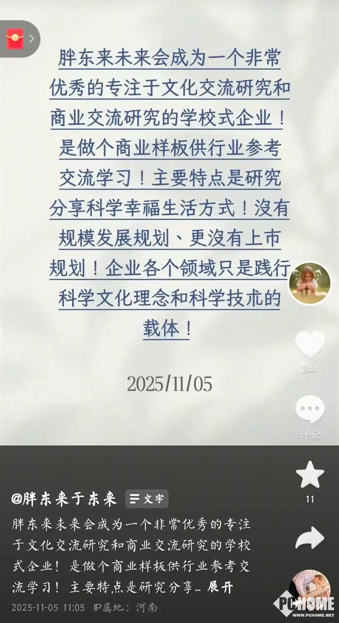 于东来发布图文表示,胖东来未来会成为一个非常优秀的专注于文化交流研究和商业交流研究的学校式企业,是做个商业样板供行业参考交流学习,主要特点是研究分享科学幸福生活方式。没有规模发展规划、更没有上市规划!企业各个领域只是践行科学文化理念和科学技术的载体。
