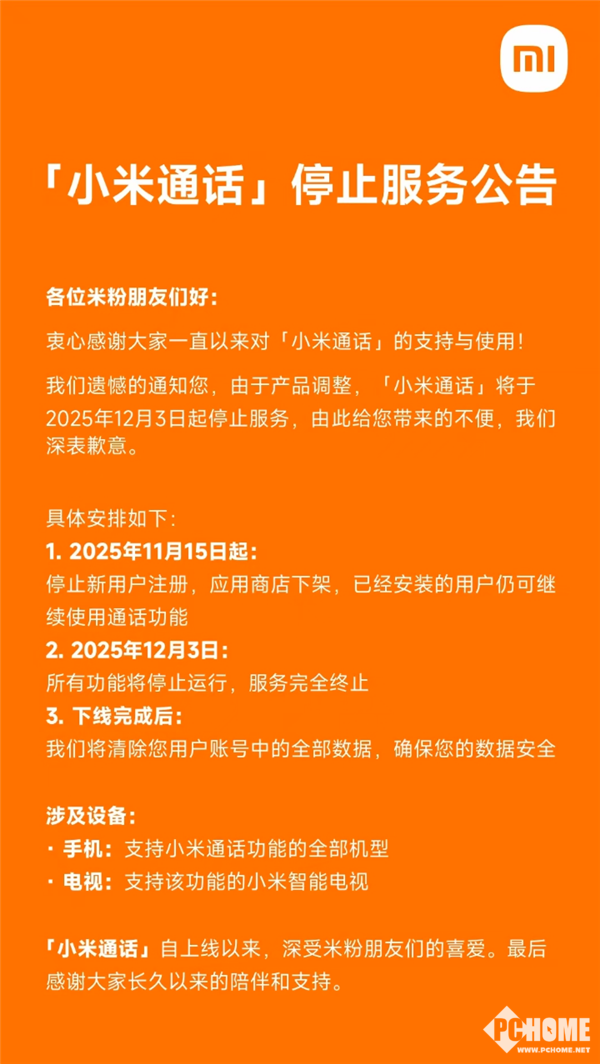 根据公告时间表,11月15日起,小米通话将停止新用户注册并从应用商店下架,但已安装用户可继续使用功能至12月3日。12月3日当天,应用所有功能将停止运行,服务全面终止。尤为关键的是,服务下线完成后,用户账号内的全部数据将被彻底清除,以保障数据安全。
