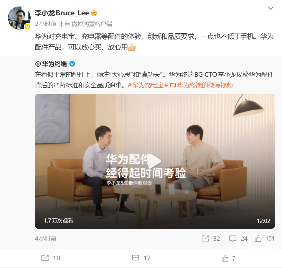 11月5日,华为终端官方微博今日发布了华为终端BG CTO李小龙接受媒体采访时的视频。李小龙在采访中介绍了华为配件背后的标准,并表示:“华为历史上充电宝从来没有召回过。”