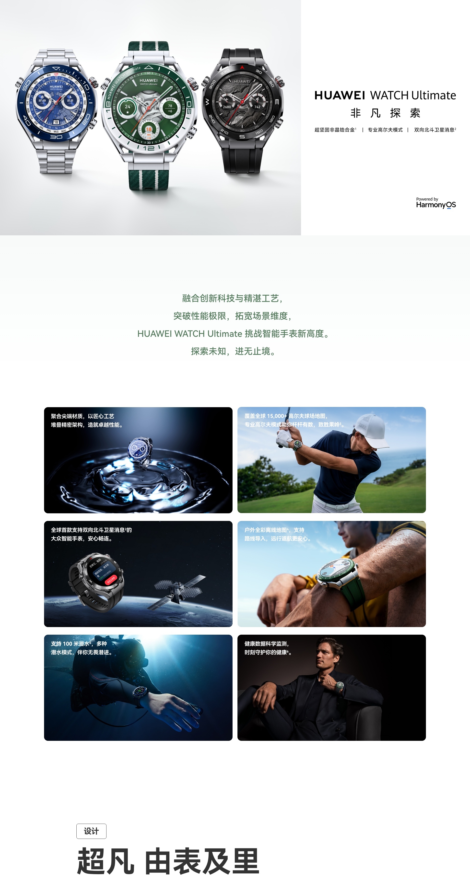 官方资料显示,华为WATCH Ultimate系列是华为推出的高端智能手表系列,目前有驰骋山地、纵横海洋等款式,售价5999元。该系列手表采用蓝宝石玻璃、陶瓷表圈、非晶锆合金等材质,坚固耐用。配备1.5英寸LTPO AMOLED屏,支持双向北斗卫星消息、100米深潜等功能。具备心率监测、ECG心电分析等专业健康管理功能,还支持100多种运动模式。电池容量为530mAh,典型使用场景续航可达14天。