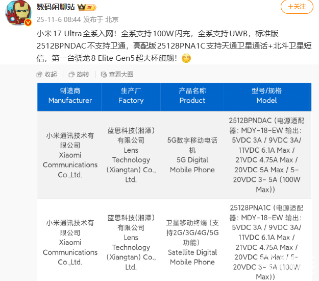 据介绍,小米17 Ultra将推出标准版(型号2512BPNDAC)和高配版(型号25128PNA1C)两个型号,高配版将支持天通卫星通话和北斗卫星短信。