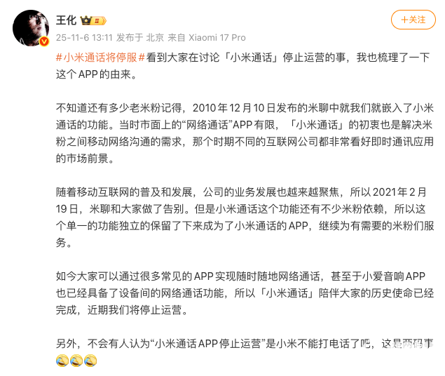 对此,小米公关负责人王化表示,小米通话之所以停服,主要是因为大家可以通过很多常见的APP实现随时随地网络通话,甚至于小爱音响APP也已经具备了设备间的网络通话功能,所以“小米通话”陪伴大家的历史使命已经完成。值得注意的是,王化还特别强调,“小米通话APP停止运营”并不意味着小米手机不能打电话。