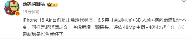 2025年11月6日消息,知名数码博主“数码闲聊站”爆料称,iPhone 18 Air(代指新一代iPhone Air)目前是正常迭代状态,配备6.5英寸高刷中屏、支持3D人脸,以及机身背采用横向跑道设计,同样定位超轻薄。但与iPhone Air不同的是,有望新增一颗广角镜头,4800万像素主摄+4800万像素超广角的镜头组合。