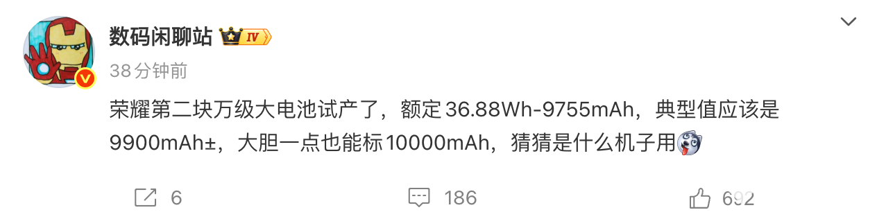 2025年11月8日,知名数码博主“数码闲聊站”爆料称,荣耀第二块万级大电池试产了,额定36.88Wh-9755mAh,典型值应该是9900mAh±,大胆一点也能标10000mAh。
