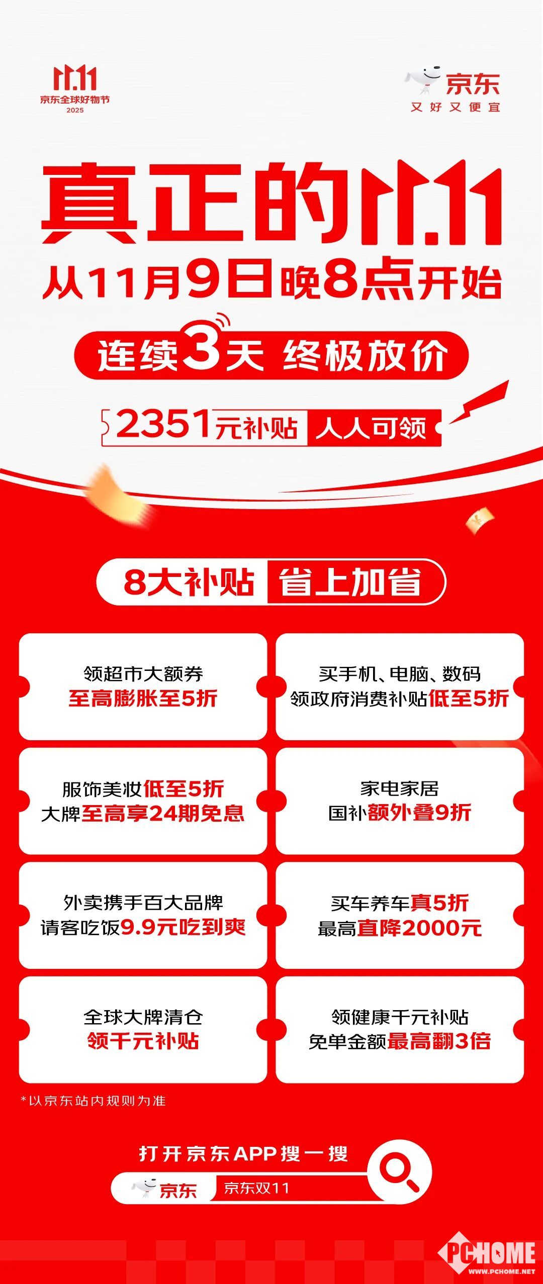 京东官宣,11月9日晚8点,京东11.11终极大放价正式启幕,这场持续3天的消费盛宴以“又好又便宜”为核心,通过全品类补贴、直播比价保障等科技化举措,为消费者带来极致购物体验。 本次活动补贴力度空前,全品类至高补贴达2351元,覆盖八大核心消费场景。