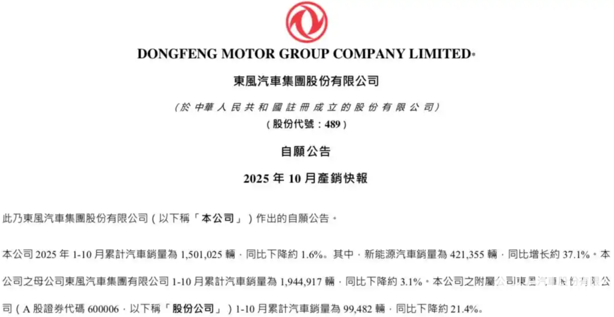 根据东风汽车集团发布的数据,2025年10月其销量为18.43万辆,同比增长16.2%,其中新能源汽车销量为5.94万辆,同比增长47.6%。前10个月,东风汽车集团累计销量为150.10万辆,同比下滑1.6%,新能源汽车累计销量为42.14万辆,同比增长37.1%。
