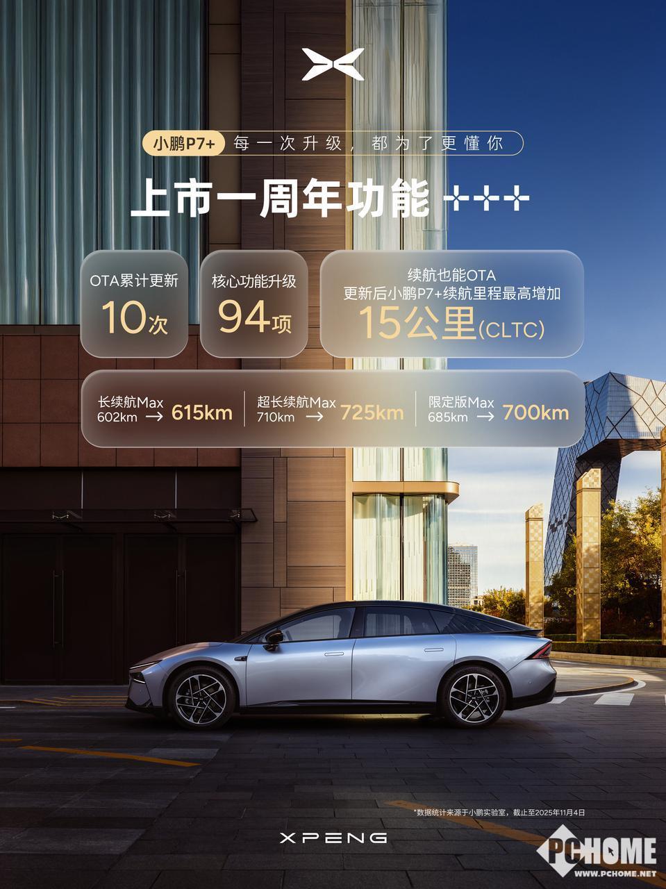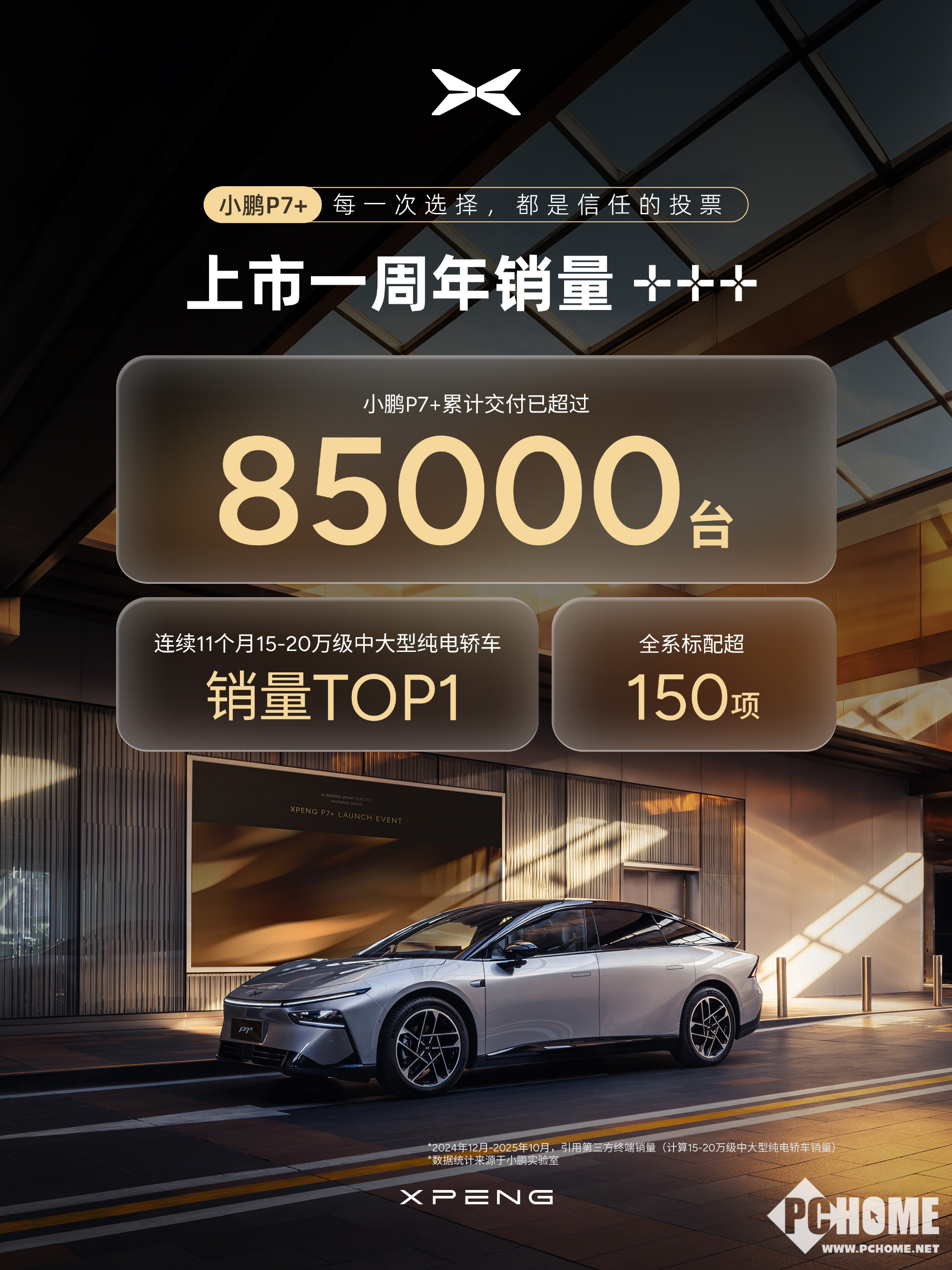2025年11月10日,小鹏汽车官微官宣,小鹏P7+上市一周年累计交付超8.5万台,连续11个月同级销冠。