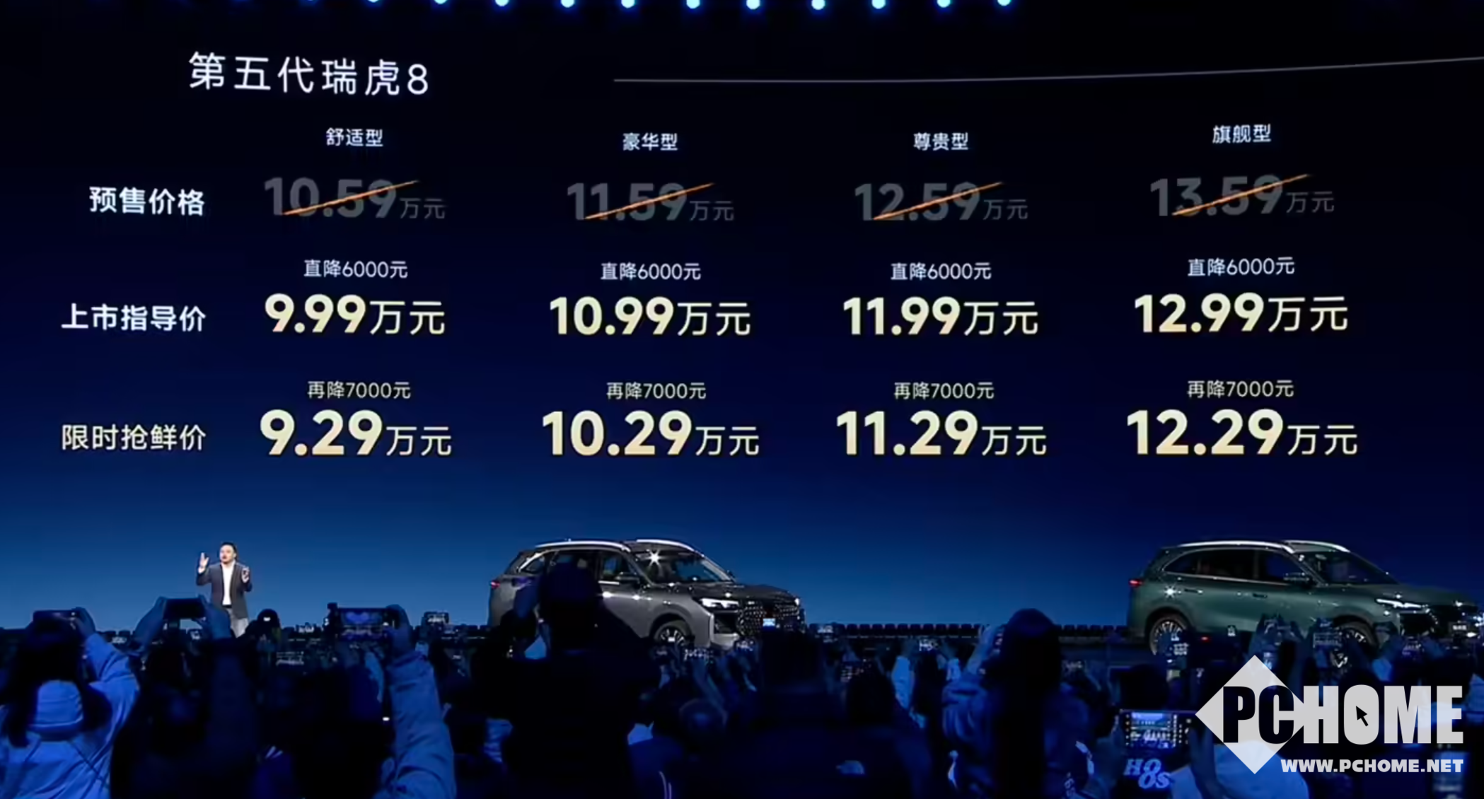 11月10日,奇瑞汽车主力SUV车型第五代瑞虎8正式上市,推出限时抢鲜价9.29万-12.29万元。新车提供“虎款”“豹款”双外观设计,全系搭载1.6T鲲鹏动力,定位中型大五座家庭SUV。