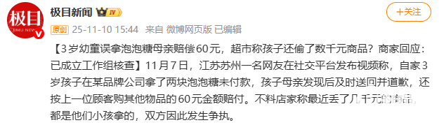 2025年11月11日消息,据极目新闻,近日,有网友发视频称,自己家的3岁孩子在“好想来零食乐园”拿走2块泡泡糖未付款,很快被孩子母亲发现,马上将商品送回并向超市道歉。意想不到的是,超市老板称,近期店内丢失价值几千元的商品均为其孩子所为。