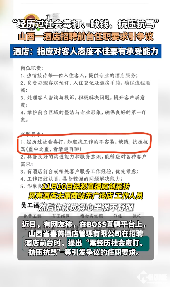 经视直播爆料称,BOSS直聘平台上,山西省喜芮酒店管理有限公司发布酒店前台招聘要求,任职者需“经历过社会毒打,知道找工作不容易,缺钱,抗压抗骂”,并标注“这一点是重中之重,看清楚再聊”。