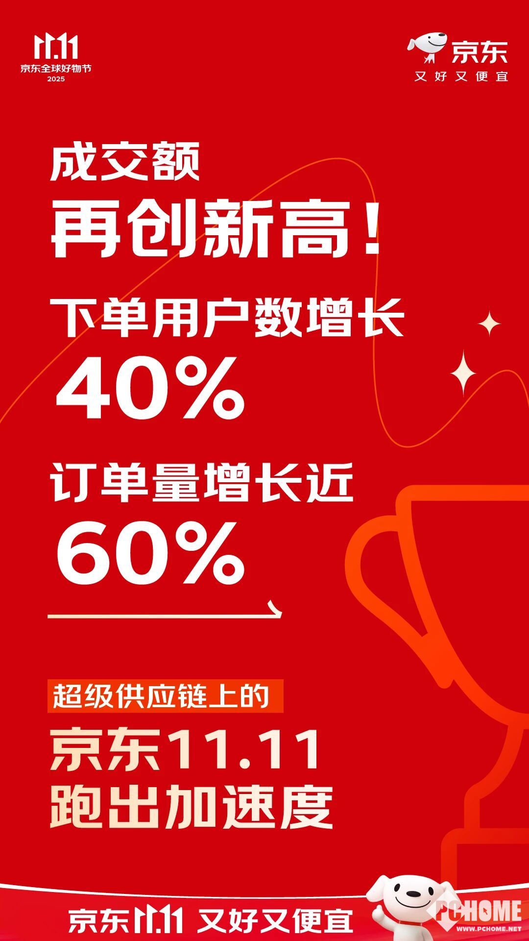 2025年11月12日,京东11.11大促战报正式揭晓,截至11月11日23:59,成交额再攀新高,下单用户数同比增长40%,订单量增幅近60%,APP活跃用户增长稳居行业首位,消费者综合好评度领跑行业。