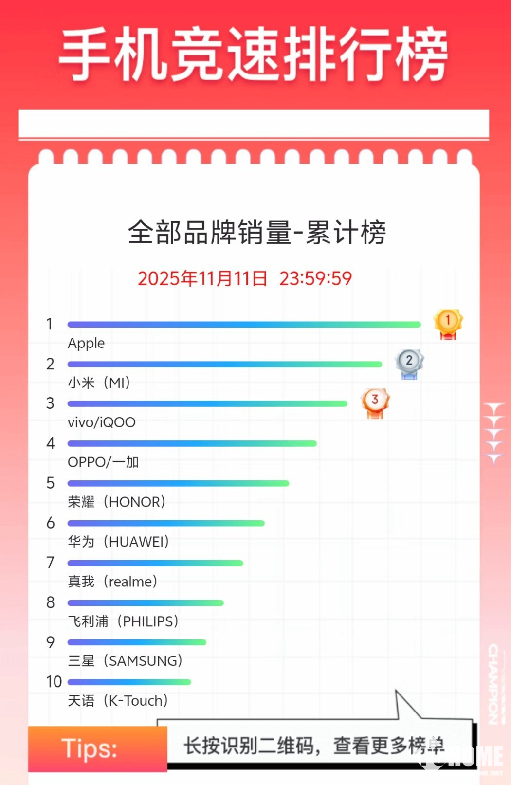 京东平台数据显示,手机全品牌销量累计榜,苹果、小米、vivo/iQOO位列销量榜前三,榜单前十位品牌还有OPPO/一加、荣耀、华为、真我、飞利浦、三星、天语。