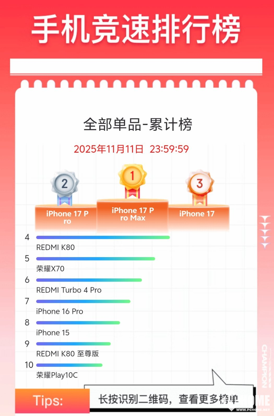 销量榜具体机型方面,iPhone 17 Pro Max、iPhone 17 Pro和iPhone 17位列前三,Redmi K80和荣耀X70紧随其后。