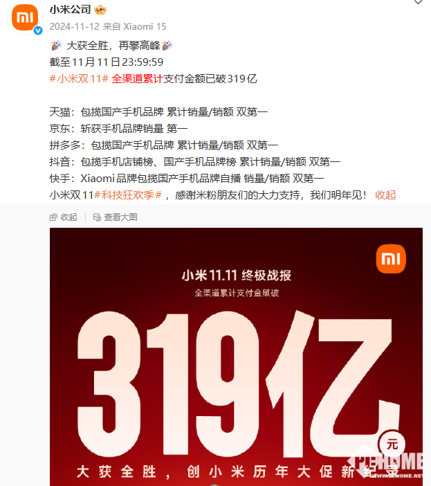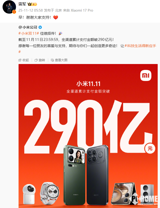 2025年11月12日消息,小米公司官方宣布“双11”战报,截至11月11日23:59:59,全渠道累计支付金额破290亿元。小米创办人,董事长兼CEO雷军在社交媒体发文回应,谢谢大家支持。