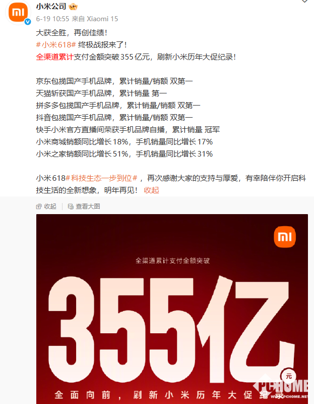 综合小米近三年“大促”战报,2025年“618”全渠道累计支付金额破355亿,2024年“双11”全渠道累计支付金额破319亿元,2023年“双11”全渠道累计支付金额破224亿元,2022年“双11”全渠道累计支付金额破170亿元。据小米战报“小字”显示,全渠道包含小米商城、小米之家、小米有品、各大授权电商和授权零售商,数据统计时间为2025年10月1日00:00:00至2025年10月12日23:59:59(含个别品类提前数据)。
