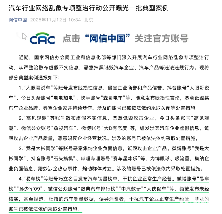 2025年11月12日,国家网信办会同工业和信息化部等部门联合通报汽车行业网络乱象专项整治行动进展,一批存在违法违规行为的账号被依法处置,其中“易车榜”等账号因发布不实汽车销量榜单成为典型案例。此次专项整治聚焦汽车行业网络突出问题,重点打击散布虚假信息、恶意诋毁企业及产品、干扰正常经营秩序等行为。