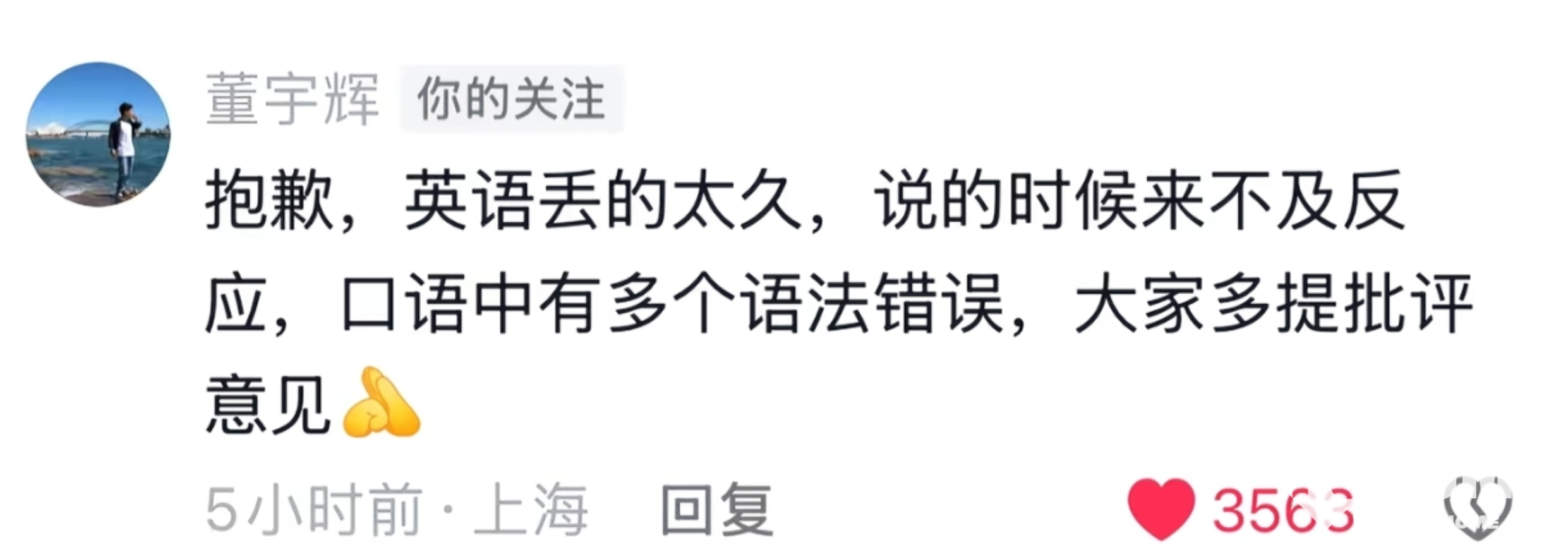 随后,与辉同行主播,东方甄选高级合伙人董宇辉回应表示,抱歉,英语丢的太久,说的时候来不及反应,口语中有多个语法错误,大家多提批评意见。