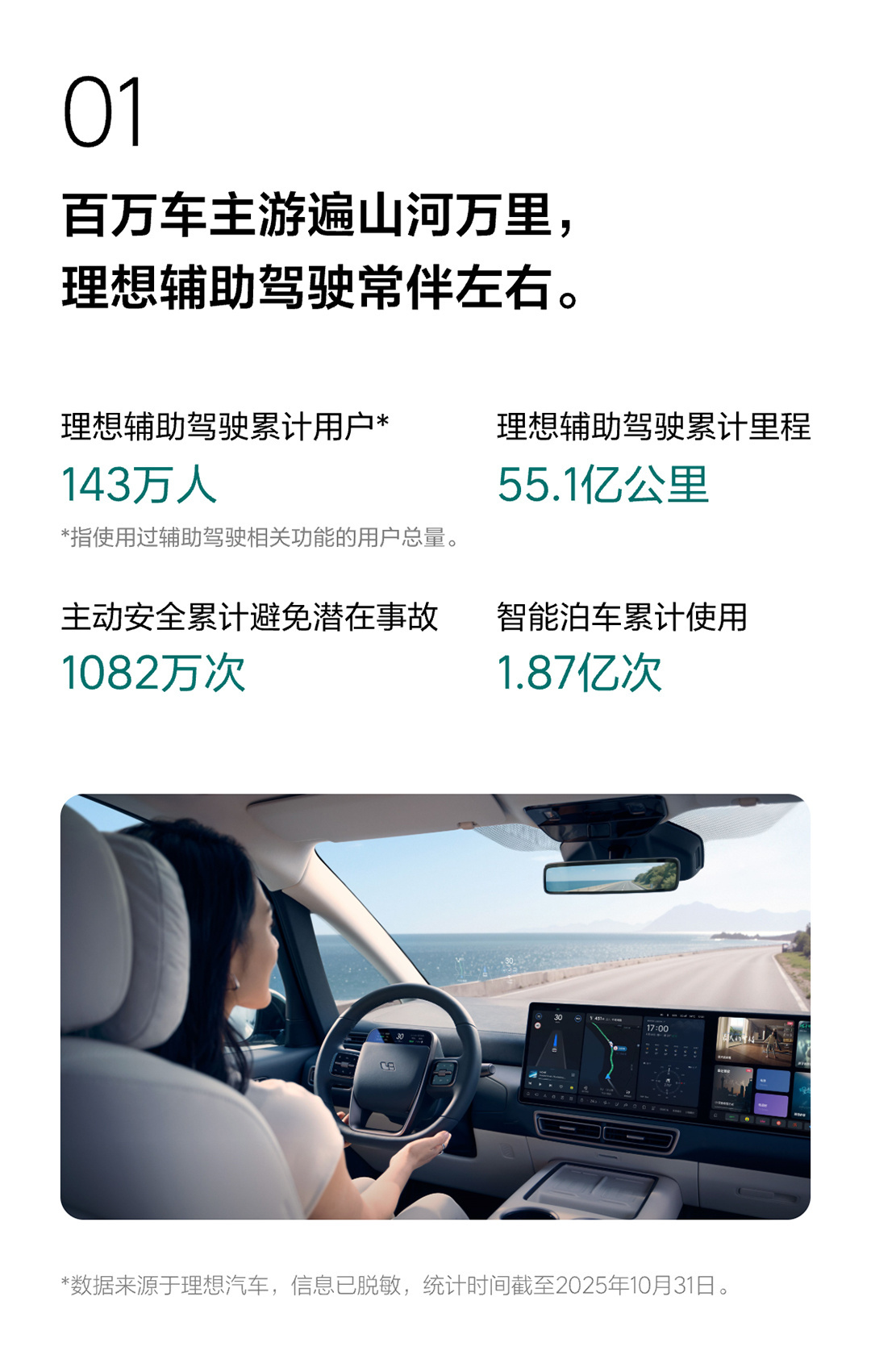 2025年11月14日,理想汽车公布了《理想辅助驾驶10月出行报告》,截至10月31日,理想辅助驾驶累计里程55.1亿公里,主动安全累计避免潜在事故1082万次。