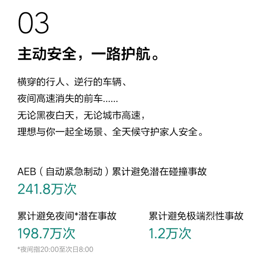理想汽车AEB(自动紧急制动)系统累计避免潜在碰撞事故241.8万次,其中累计避免夜间(20:00至次日8:00)潜在事故198.7万次,累计避免极端烈性事故1.2万次,为用户及家人的出行安全筑起了坚实防线。