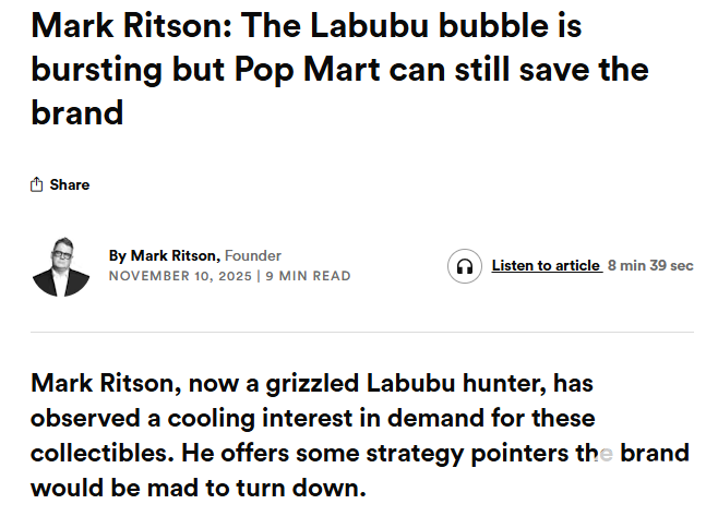 2025年11月14日消息,Thedrum网站创始人、知名市场营销专家Mark Ritson马克·里特森教授,近日发文表示,泡泡玛特LABUBU的泡沫正在破裂,热度下降、收藏需求也在降温,2025年第四季度业绩可能不及预期。