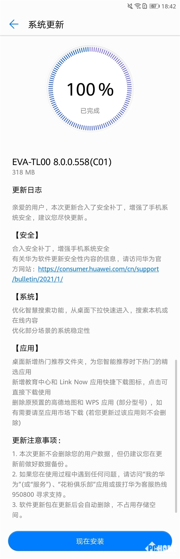 近几年,国产手机的系统更新速度还是蛮快的,但是一般仅限于两三年之内的,而那种五六年前的机型很少会收到更新推送,毕竟存在着手机硬件限制等原因。令人惊讶的是,5年前发布的华为P9竟然迎来了EMUI 8.0系统,版本号为EVA-TL0O 8.0.0.558 (C01),大小318MB。