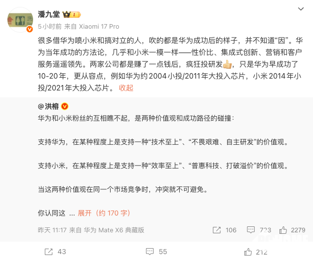 2025年11月14日,小米产业投资部合伙人潘九堂在社交媒体发文称,很多借华为喷小米和搞对立的人,吹的都是华为成功后的样子,并不知道“因”。