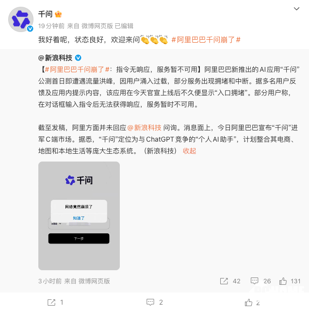 随后,有媒体表示,因海量用户涌入,千问出现服务拥堵和中断等问题。对此,千问官微转发“阿里巴巴千问崩了”的话题表示,“我好着呢,状态良好,欢迎来问”。
