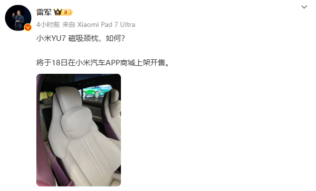 2025年11月17日,小米创办人,董事长兼CEO雷军在微博上官宣,11月18号,小米汽车APP商城将上架开售磁吸颈枕。