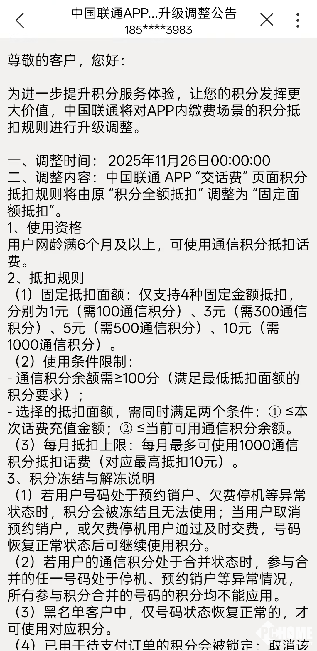2025年11月17日,中国联通发布公告称,将对App内“交话费”场景的通信积分抵扣规则进行调整。此次调整将于今年11月26日0点正式生效,意味着用户沿用多年的“积分全额抵扣”方式将成为历史,取而代之的是更为严格的“固定面额抵扣”机制。