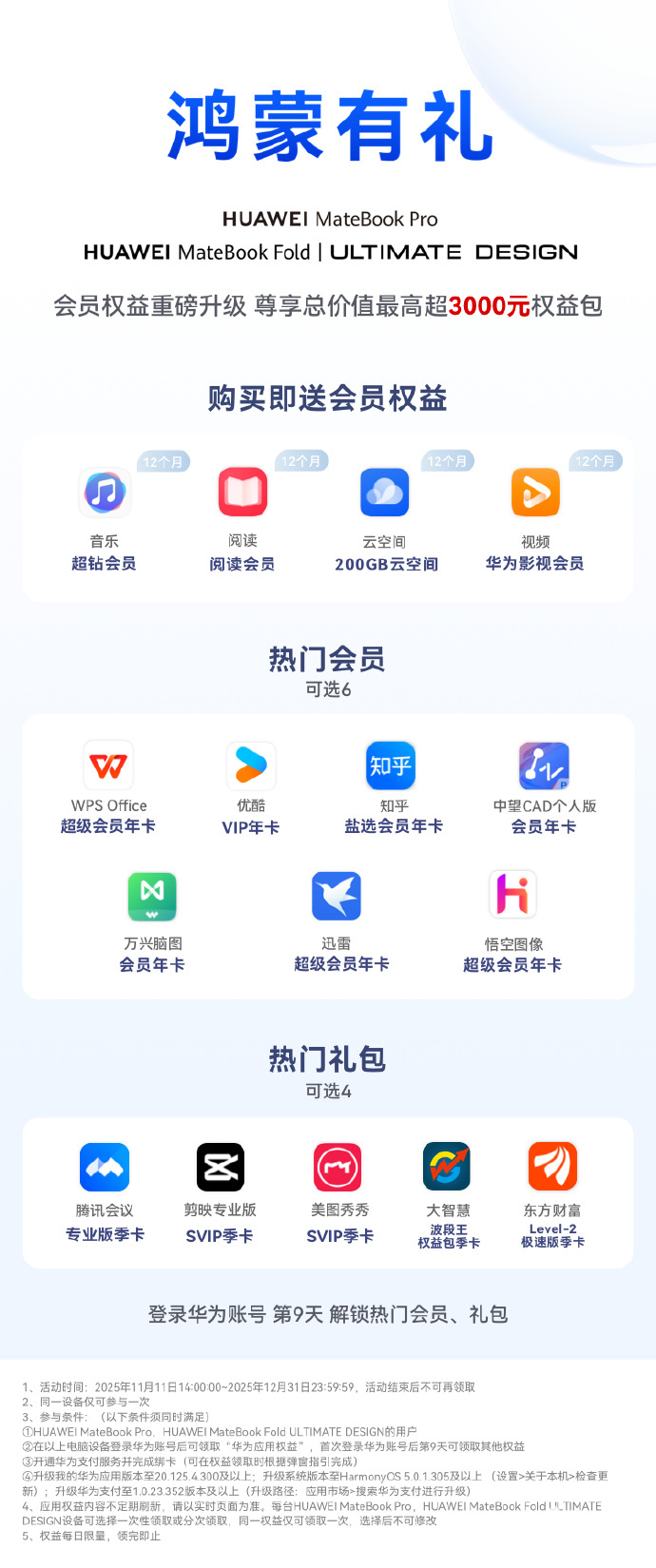 近日,华为终端官方发文宣布,新一期鸿蒙电脑“鸿蒙有礼”活动权益重磅升级,从11月11日至12月31日,购买HUAWEI MateBook Pro或者HUAWEI MateBook Fold非凡大师并在该设备上登录我的华为,可享受总价值最高3000元权益礼包,权益包含华为视频、音乐、华为阅读、云空间等会员年卡。