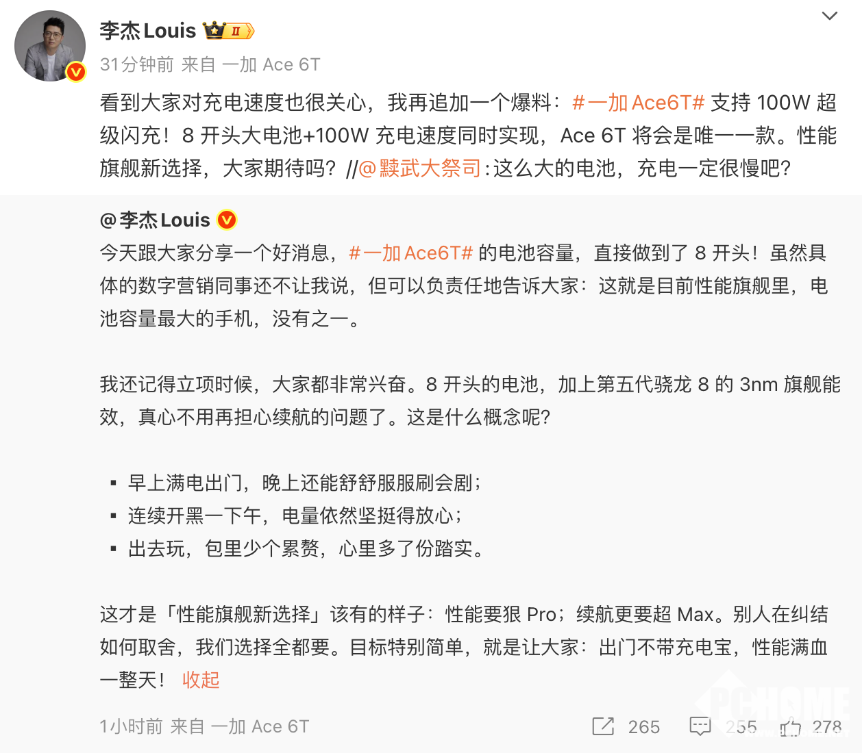一加中国区总裁李杰透露,一加Ace 6T的电池容量,做到了8开头,也就是超8000mAh,堪比充电宝,此外,一加Ace 6T还支持100W超级闪充。李杰称,8开头大电池+100W充电速度同时实现,Ace 6T将会是唯一一款。