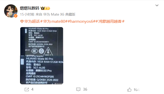 2025年11月17日,博主“熠熠玩数码”曝光了华为Mate 80 Pro系列包装盒,包装盒信息显示,Mate 80 Pro提供12GB和16GB内存版本,对应不同处理器配置:12GB版本(型号SGT-AL50)搭载麒麟9030,16GB版本(型号SGT-AL00)则搭载麒麟9030 Pro。据悉,华为Mate 80系列发布会已经定档11月25日14:30。