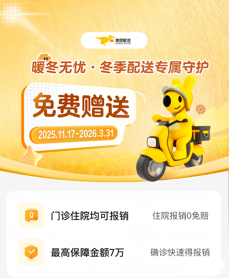 此次推出的“防寒险”由美团全额承担费用,骑手无需额外操作即可自动获得保障。保障范围覆盖低温、冰雪、大风等严寒天气引发的医疗健康支出,门诊与住院均可报销且住院0免赔,最高保障金额达7万元,确诊后可快速完成报销流程,保障周期从2025年11月17日持续至2026年3月31日。