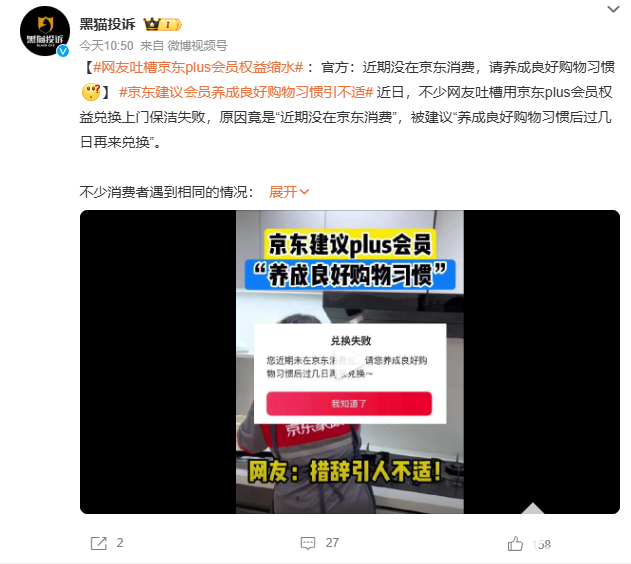 有网友反映京东PLUS会员权益缩水问题,无法正常领取超级补贴、优惠券等权益,客服解释竟是“近期没在京东消费”并建议用户多下单,需养成良好购物习惯,提示语措辞引人不适,对此有网友表示:“买个东西还要被教育,京东爹味别太重了。”