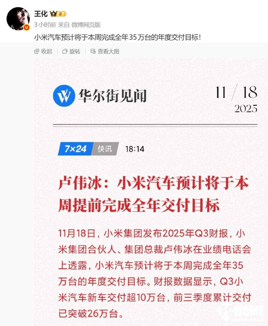 11月18日,小米集团合伙人、总裁,手机部总裁,小米品牌总经理卢伟冰在三季度业绩电话会上明确表示,小米汽车预计于本周内完成全年35万台交付目标,较原计划提前一个多月,标志着其规模化交付能力实现阶段性突破。小米公关负责人王化也在微博确认了该消息。这一目标是雷军在2025年初从原定30万台上调后的新指标,提前达成引发行业广泛关注。