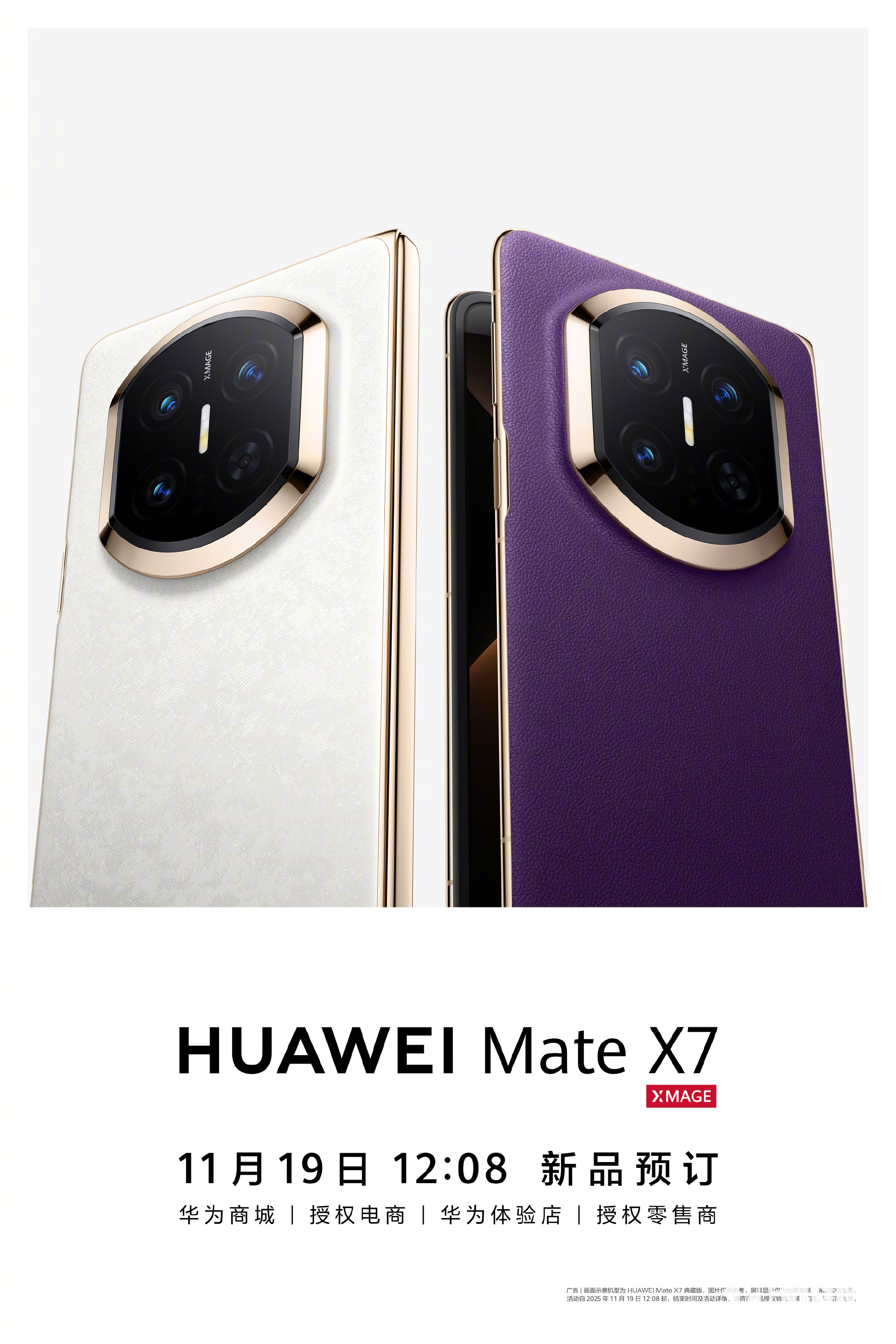 宣传海报显示,华为Mate X7折叠屏手机将于今日12:08在华为商场、授权电商、华为体验店、授权经销商等渠道同步开启预定。
