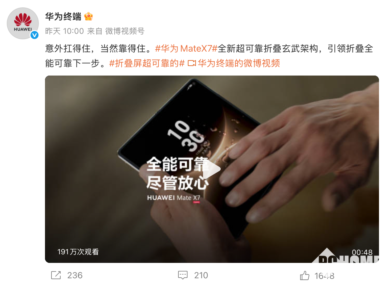 2025年11月19日,华为终端官微发布消息称,华为Mate X7折叠屏手机今日开启预定。