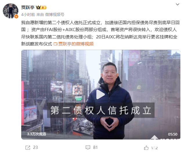 贾跃亭于2025年11月19日发博表示第二个债权人信托正式成立,将加速偿还国内担保债务,尽责到底早日回国。