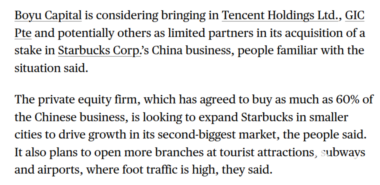 近日,彭博社爆料称,据知情人士透露,博裕资本正考虑引入腾讯控股有限公司、新加坡政府投资公司(GIC Pte)以及可能的其他方作为有限合伙人,以助力其收购星巴克公司中国业务的股权。