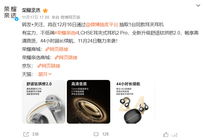 荣耀亲选于11月17日发博官宣LCHSE耳夹式耳机2 Pro,全新升级舒适钛拱桥2.0,畅享高清音质,44小时超长续航,支持无线充电,11月24日正式发布。