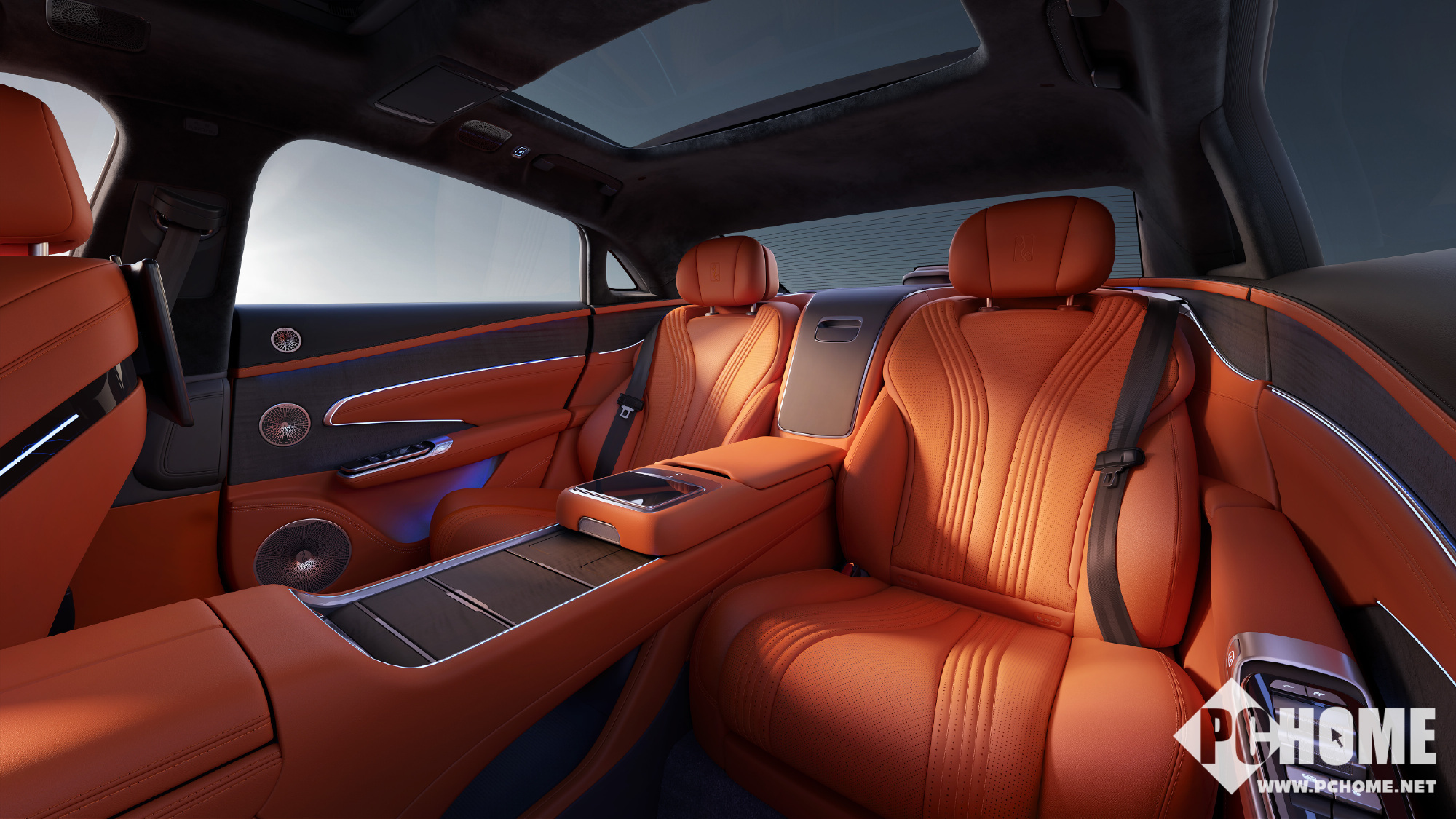 引人注目的“旭光橙”打破了以往豪华车采用黑色与米色内饰的惯例,带有一定质感的全新色调。同时,提供四座及五座两种座椅布局,支持22向调节,包含腰部支撑、通风、加热、热石按摩等功能,中控台以大尺寸中控屏为中心,两侧对称分布着嵌入式的液晶主仪表和副驾娱乐屏,形成“三屏环绕”的视觉张力。