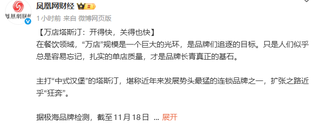 2025年11月19日消息,据凤凰网财经报道,主打“中国汉堡”快餐连锁品牌塔斯汀,2020年至2025年,每年新开门店超2000家,目前已有门店10289家。门店规模行业排名第三位,仅次于华莱士(门店18595家)和肯德基(门店13031家)。塔斯汀正式跨入“万店”之列,就在扩张之路上“狂奔”时,极海品牌监控数据显示,近90天,塔斯汀门店新开1016家,关店810家,一边疯狂开店,一边加速关店。