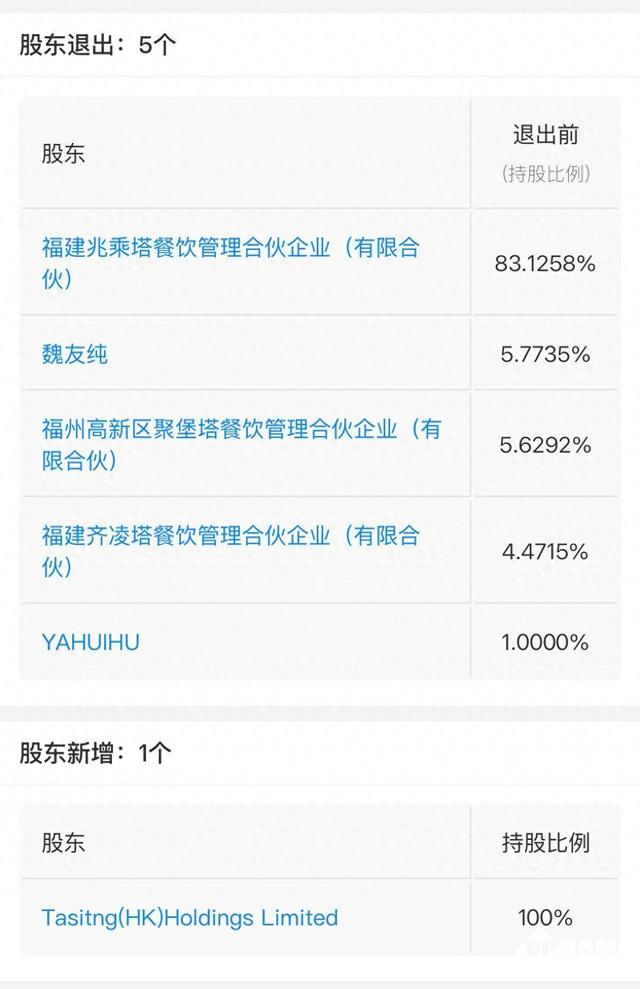 值得注意的是,今年,塔斯汀发生重大股权变动,福州塔斯汀餐饮管理有限公司注册资本,从103万元增至1.18亿元,增幅达11323%。公司原股东福建兆乘塔餐饮管理合伙企业、魏友纯、福州高新区聚堡塔餐饮管理合伙企业、福建齐凌塔餐饮管理合伙企业和YAHUIHU集体退出,由香港公司Tasting (HK) Holdings Limited成为唯一控股股东,股权穿透显示,公司由开曼群岛的公司实体控股,唯一董事为魏友纯。业内人士表示,股权变动和增加注册资本,被视为塔斯汀正在筹备上市。