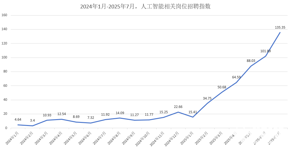近日,据脉脉发布的《2025 年 AI 人才流动报告》数据显示,2025年1至7月,AI新发岗位量同比增长超10倍,简历投递量也暴涨了11倍,中国AI相关岗位数量激增,1000多家AI公司在脉脉上发布了超过7.2万个高薪岗位,年薪最高可达140万元。