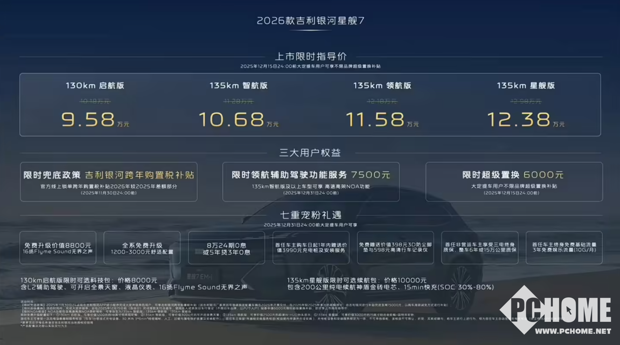 11月19日,吉利银河官方宣布2026款银河星舰7 EM-i正式上市,新车推出4款配置车型,官方指导价10.18万元-12.98万元,限时优惠后售价9.58万元-12.38万元,即日起全渠道开启交付。作为年度改款车型,新车在续航、智能配置上实现核心升级,剑指10万级插混SUV主流市场。