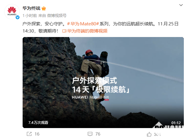 2025年11月20日,华为终端官宣,华为Mate 80系列手机支持“户外探索模式”,可实现14天“极限续航”。