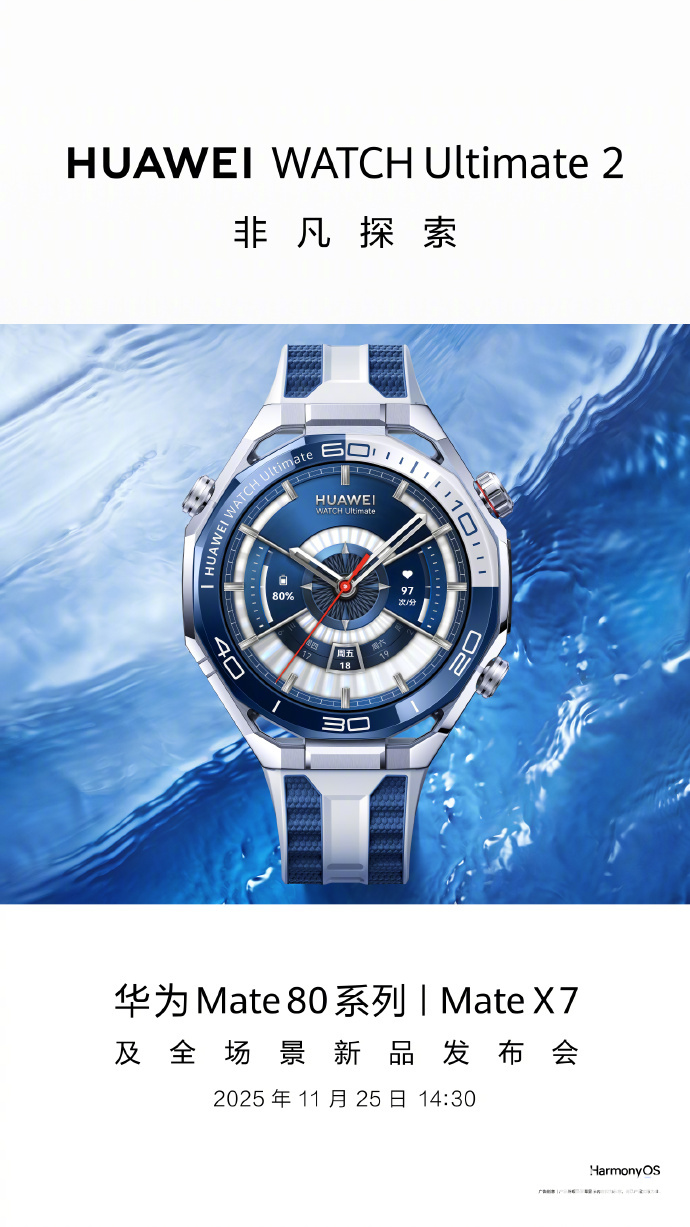 11月20日华为终端官方发博:华为 WATCH Ultimate 2非凡探索手表将于11月25日14:30与华为Mate80系列一起正式发布。该款产品目前已开启预售,可在京东官方旗舰店,华为商城等选购。