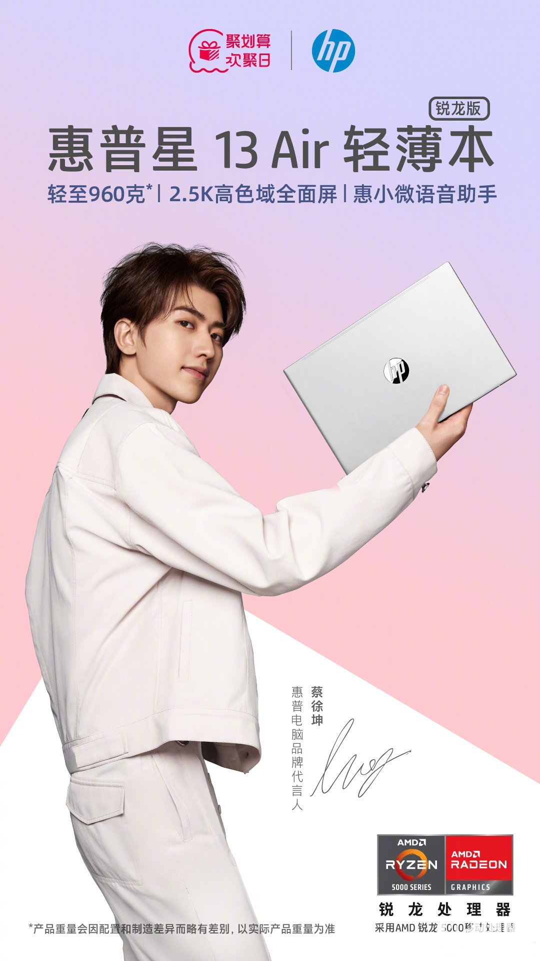 今日,蔡徐坤代言的惠普星13 Air轻薄本锐龙版正式上市,官方首发价4999元起,现在购机赠送限量冲锋鸭精美礼盒。惠普星13 Air锐龙版采用三面镁铝合金材质设计,并且拥有2.5K超高清的全面屏,性能方面搭载AMD Zen3架构处理器,轻至960g,最厚处仅16.9mm。