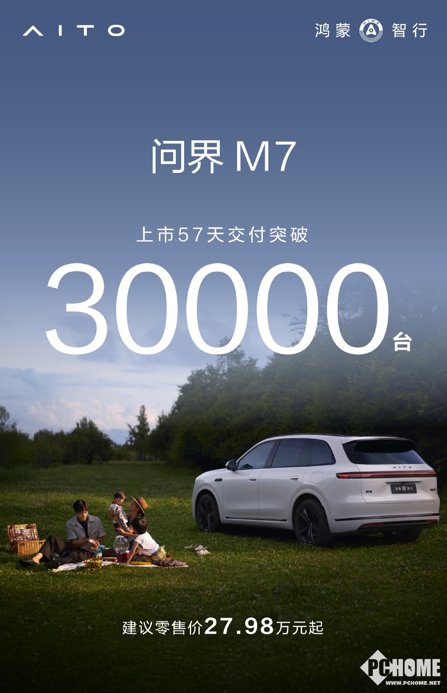 2025年11月20日,鸿蒙智行官微发布消息称,全新问界M7上市57天累计交付突破3万台,日均交付量高达526台。